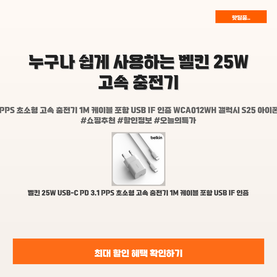 🛍️ 이 포스팅은 네이버 쇼핑 커넥트 활동의 일환으로,판매 발생 시 수수료를 제공받습니다.오늘 소개할 제품은 단연'벨킨 25W USB-C PD 3.1 PPS 초소형 고속 충전기'예요!요즘 스마트폰을 충전하는 데 시간이 너무 오래 걸리는 것에 불만이신가요?"벨킨 25W 고속 충전기"가 바로 당신의 고민을 해결해줄 제품이에요!갤럭시 S25, 아이폰16, 아이패드 등 최신 기기와 완벽 호환되니, 충전 속도와 편의성을 동시에 누릴 수 있어요! 정말 사용해보면 놓칠 수 없는 아이템라는 사실을 깨닫게 될 거예요.그리고 이 충전기는 초소형 디자인 덕분에 휴대성까지 뛰어나요! 여행이나 출퇴근 시에도 부담 없이 들고 다닐 수 있으니, 여러분도 이 편리함을 직접 느껴보세요. 소중한 시간을 절약할 수 있답니다!※ 이거 진..